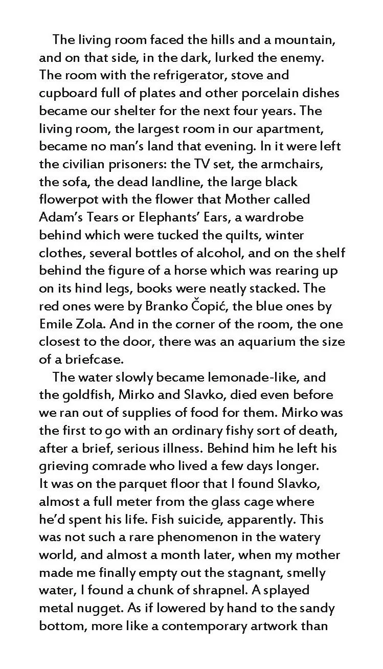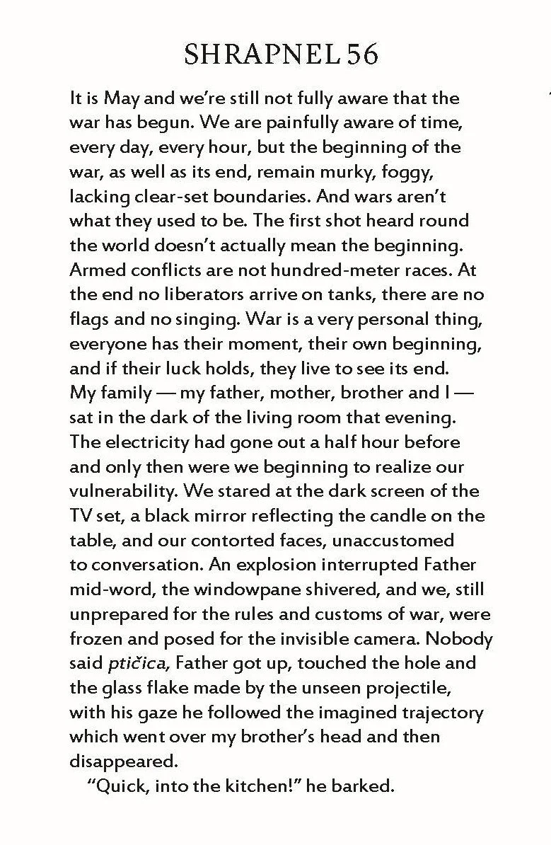 Golden Shrapnel is an intimate confession, a stream of memory from a mind shaped by war. Each “shrapnel” chapter stems from that experience. Enki Duraković, plagued by writer's block and mental unrest, describes how “his newly born nostalgia is being nourished by turning the Alps into the mountain peaks of Bosnia.” His time in Ferney-Voltaire is long enough for us to recognize in him the opposing forces of cultural adaptation and resistance. The town becomes, in his consciousness, a mirror to Sarajevo, the place of his deepest identification. — Ivana Golijanin “Voltaire Defends Sarajevo,“ Oslobođenje
